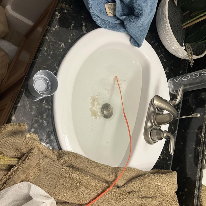 Sentinel Plumbing LLC cleared a blocked bathroom sink drain in Houston, TX. The team removed debris from the sanitary sewer line using a sewer machine and confirmed proper flow by running water through the cleaned pipe.