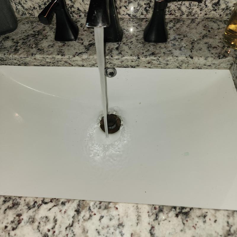 A home in Conroe, TX had a bathroom sink affected by a blockage in the sanitary sewer line. The plumber cleared the drain using a sewer machine and removed all debris. Water was tested to confirm the sewer line drained properly.